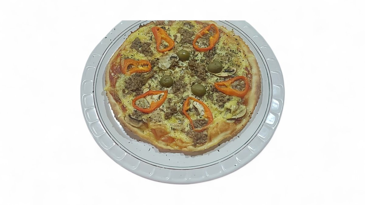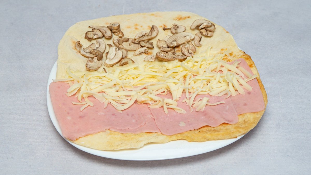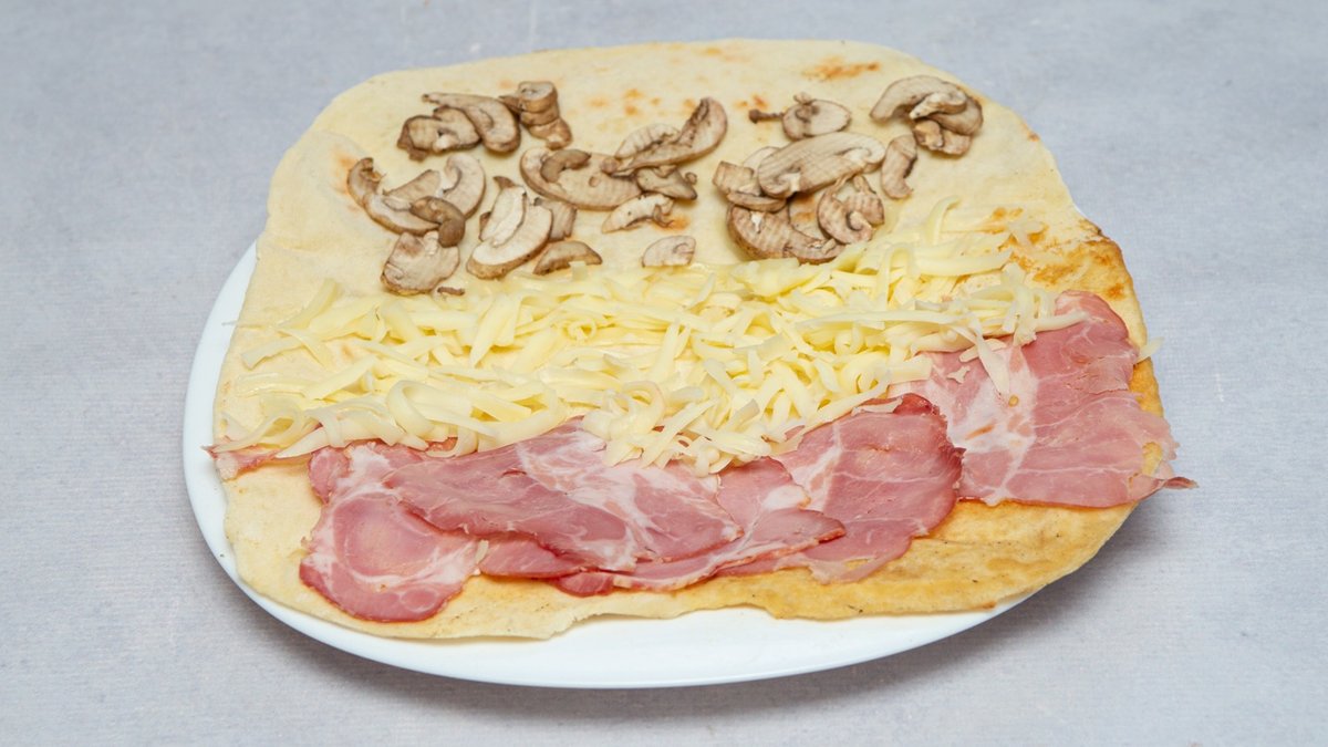 testo,pelat,šunka,kačkavalj,pečurke,suvi vrat,1 jaje,masline