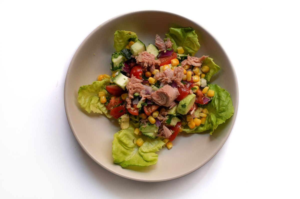 zelena salata,čeri,krastavac,avokado,šećerac,peršun,luk,tunjevina,dresing