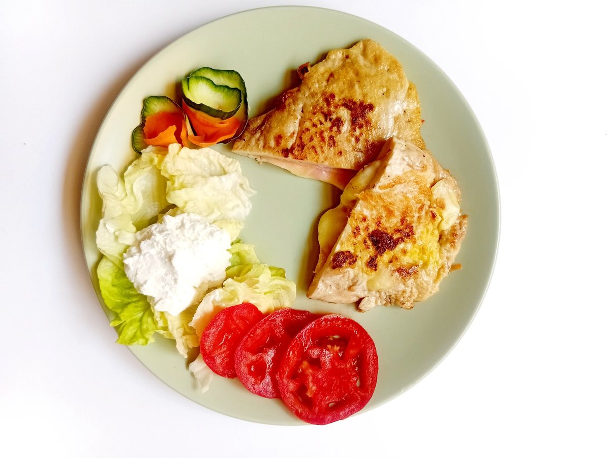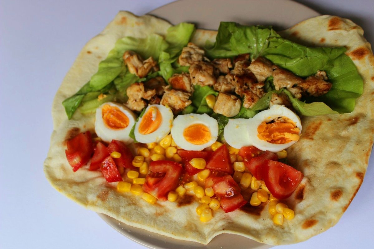 Piletina,kuvano jaje,kačkavalj,paradajz,šećerac,zelena salata