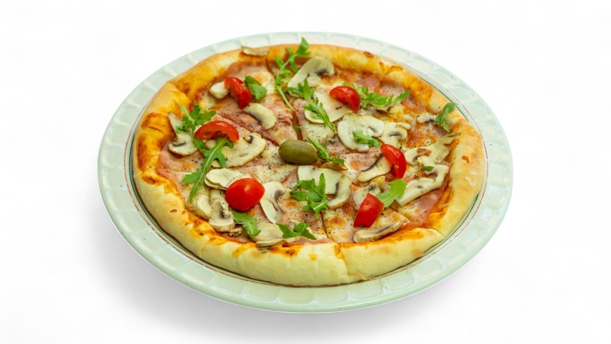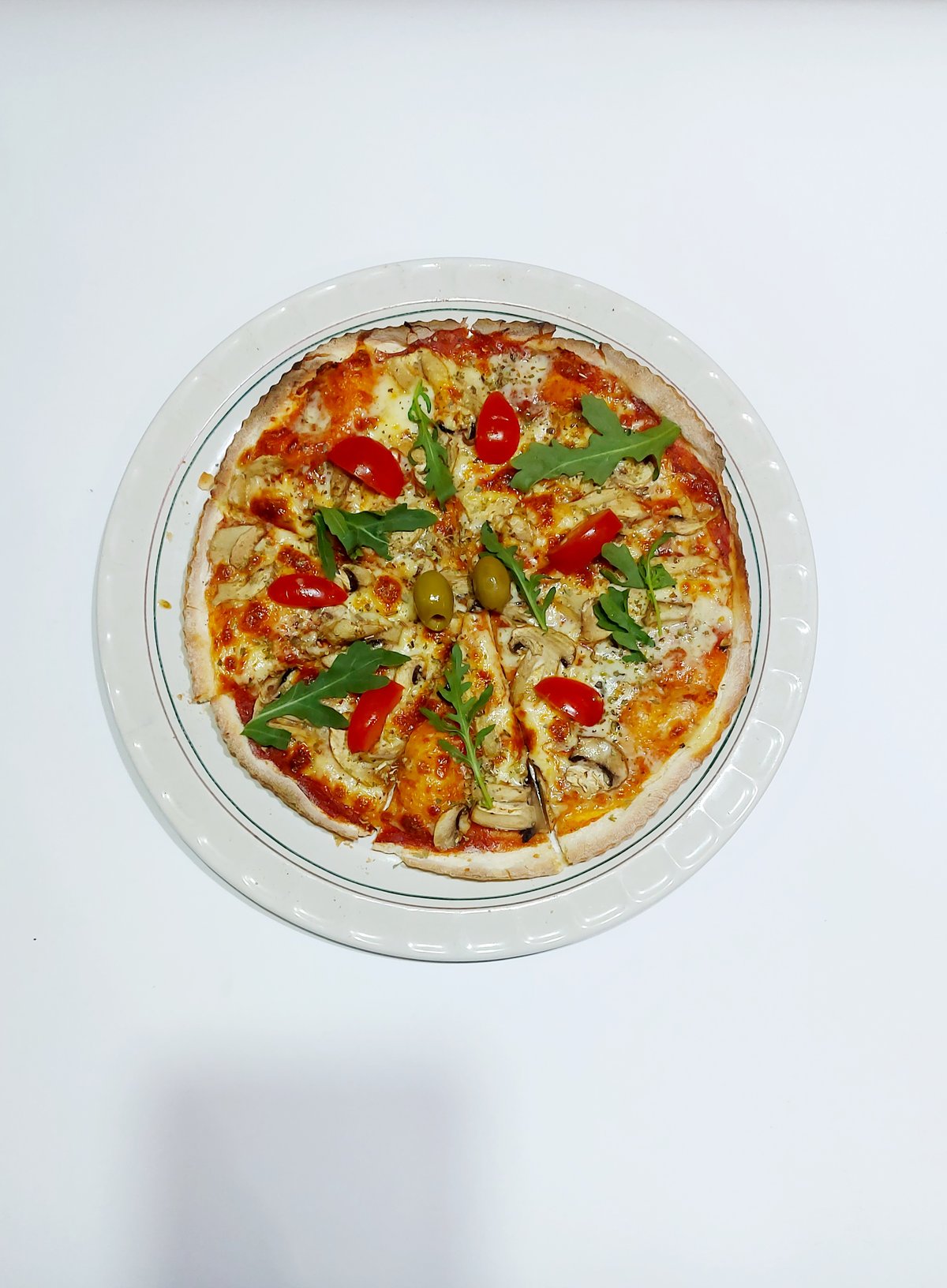 testo,pelat,šunka,kačkavalj,pečurke,čeri paradajz,rukola,masline