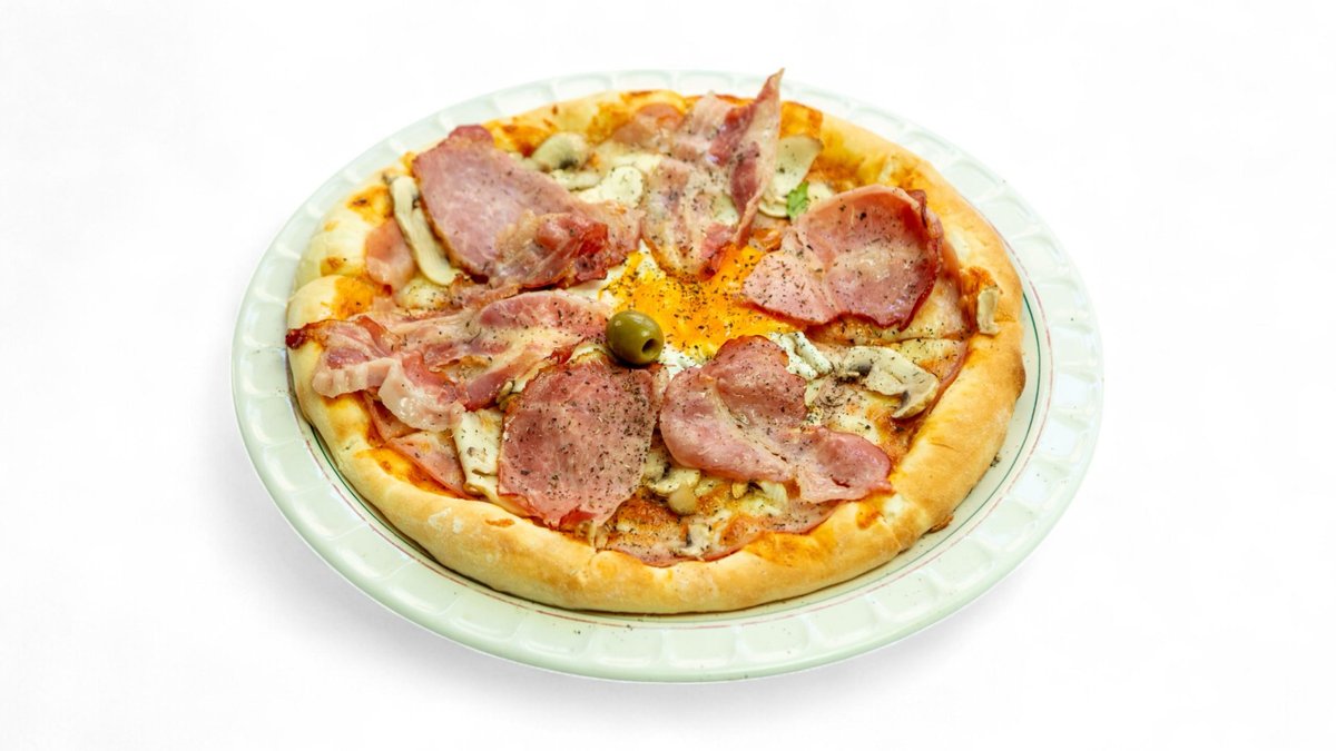 testo,pelat,šunka,kačkavalj,pečurke,suvi vrat,slanina,1 jaje,masline
