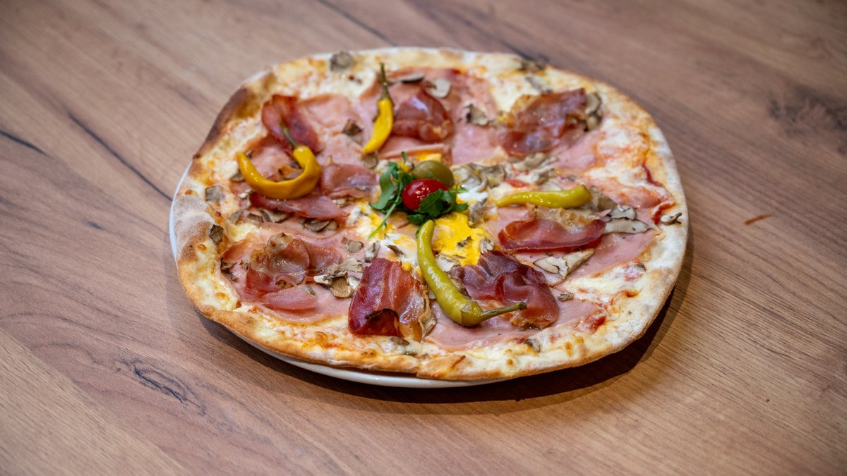 Pelat, kačkavalj, šunka, slanina, jaja, feferone, origano