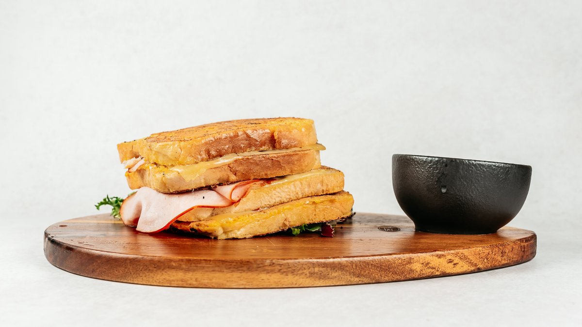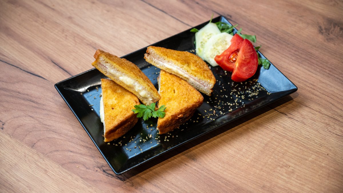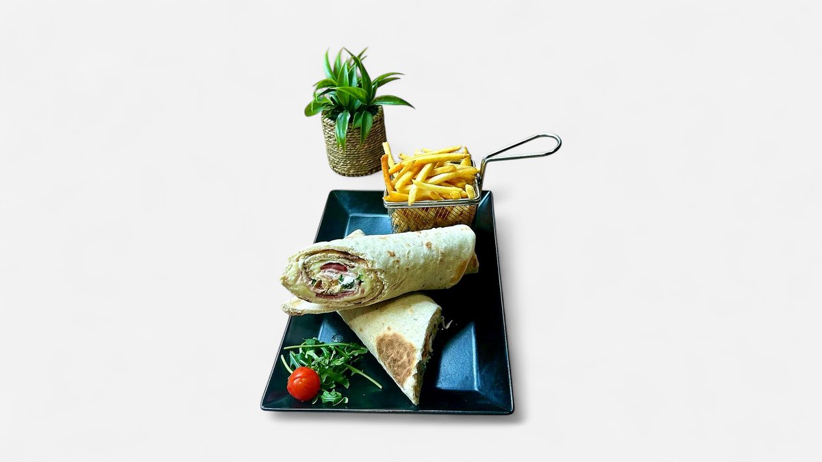 Lepinja, kačkavalj, šunka, slanina, rukola, tartar sos, pomfrit