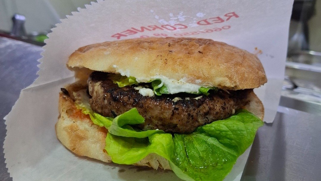 Juneće meso 150g, piletina sa pečenicom i kačkavaljem 100g, burger sos, iceberg, kiseli krastavčići, luk, paradajz