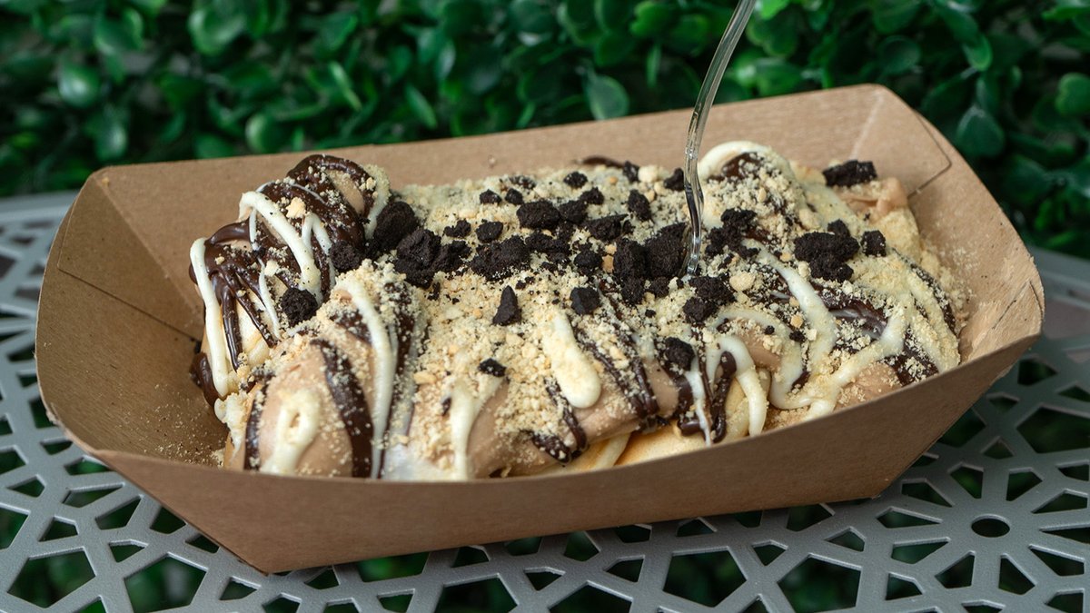 Waffle, mlečni lešnik krem, sladoled stracciatella, dekoracija, šlag, oreo keks