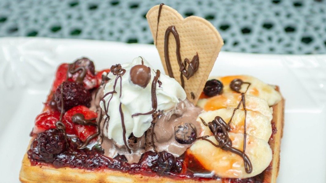 Waffle + voćni nadev + šlag + dekoracija + toping