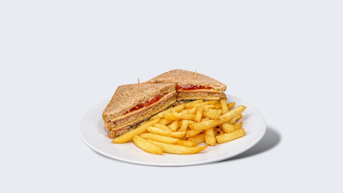 Hrskavi klub sendvič u tostiranom hlebu, punjen slojevima šunke, sira i svežeg povrća, uz dodatak sočnog namaza za pun ukus. Servira se uz porciju zlatno pečenog pomfrita. Zasitno, ukusno i idealno za brzi obrok. 🍟🥪