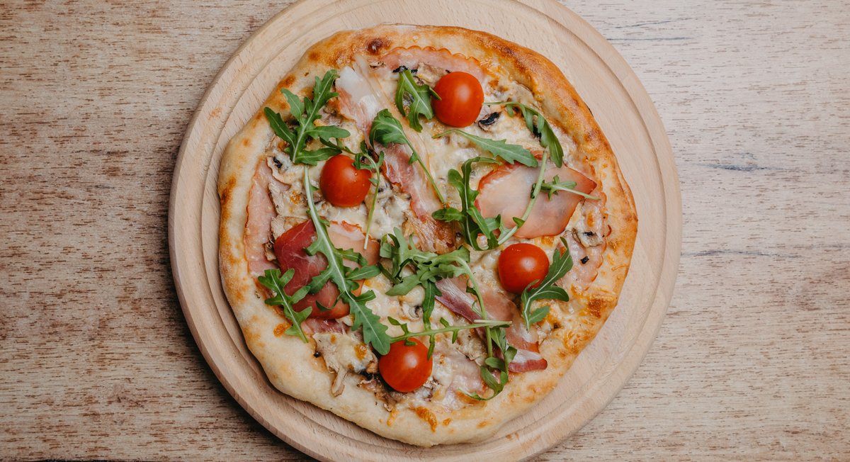 Paradajz pelat, kačkavalj, šunka, panceta, pršuta, šampinjoni, čeri paradajz, rukola