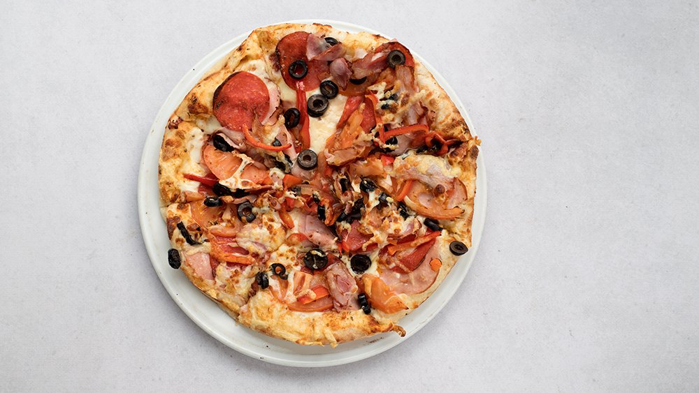 Paradajz pelat, kačkavalj, šunka, suvi vrat, čajna, masline, šampinjoni, jaje