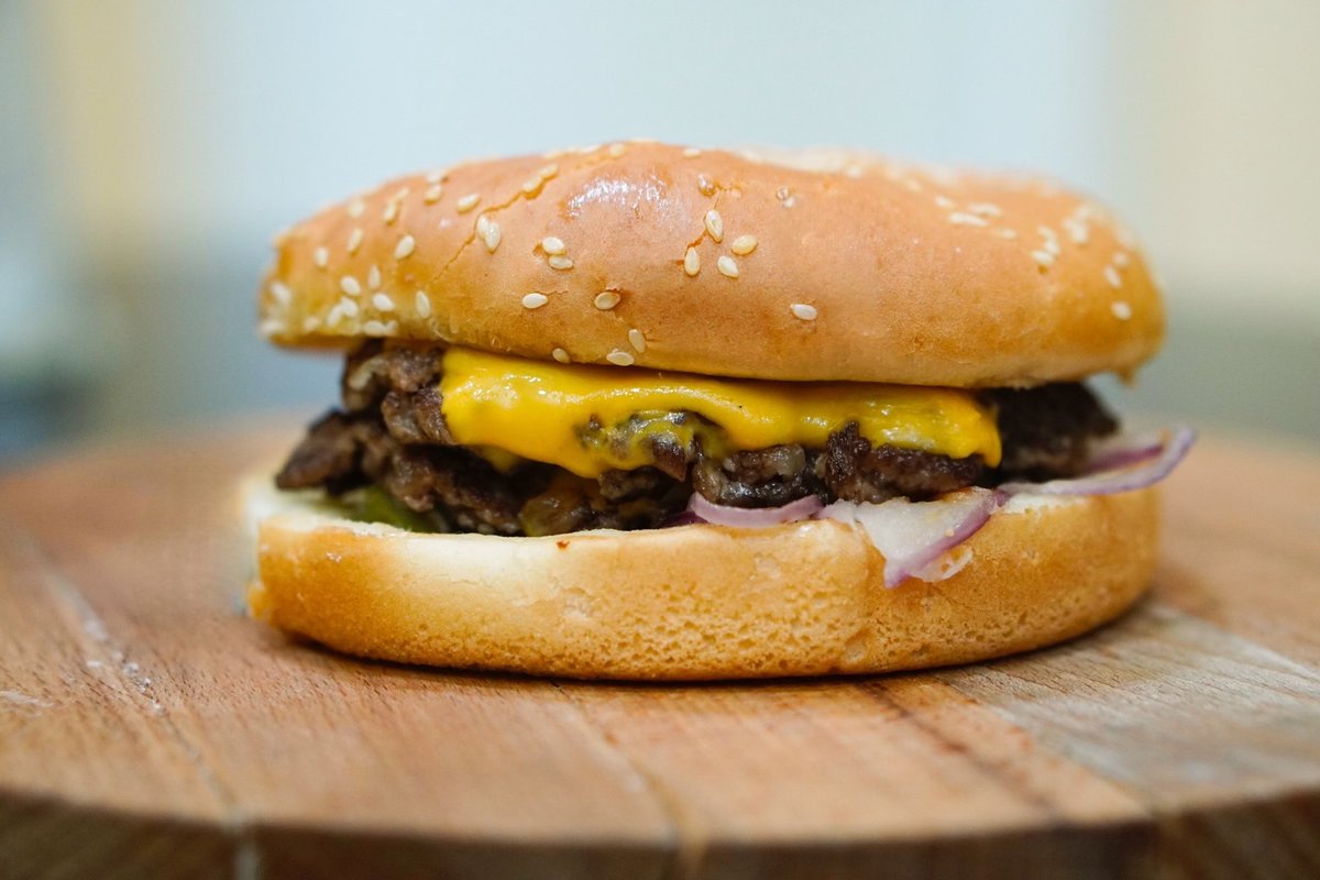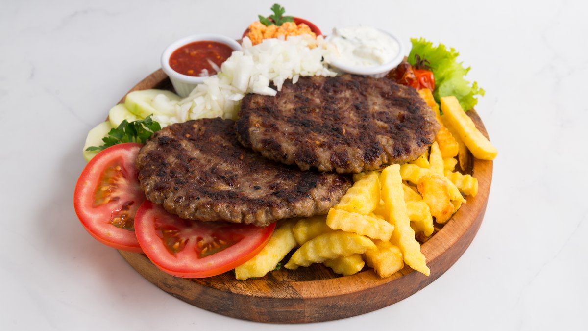 Kiseli krastavci, 2x80gr junetina 100%, cheder sir, crveni luk, hainz kecap, senf, + Pomfrit + Coca Cola