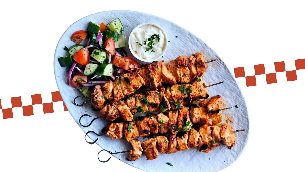 Libanski pileći ražnjić sa pomfritom, pirinčem ili domaćim krompirom i salatama po izboru.