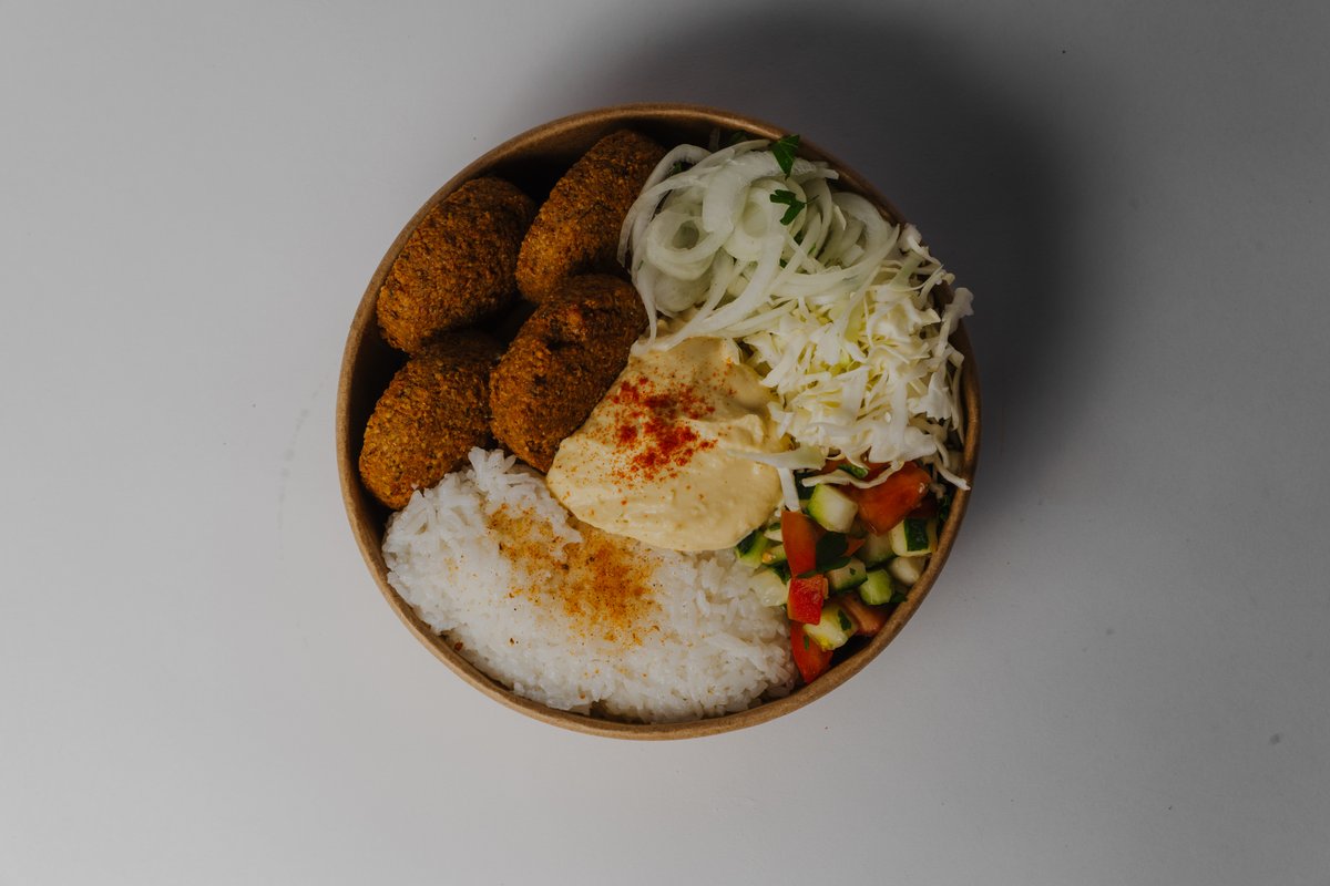 Kuglice od leblebija sa pirinčem, pomfritom ili domaćim krompirom i salatama po izboru.