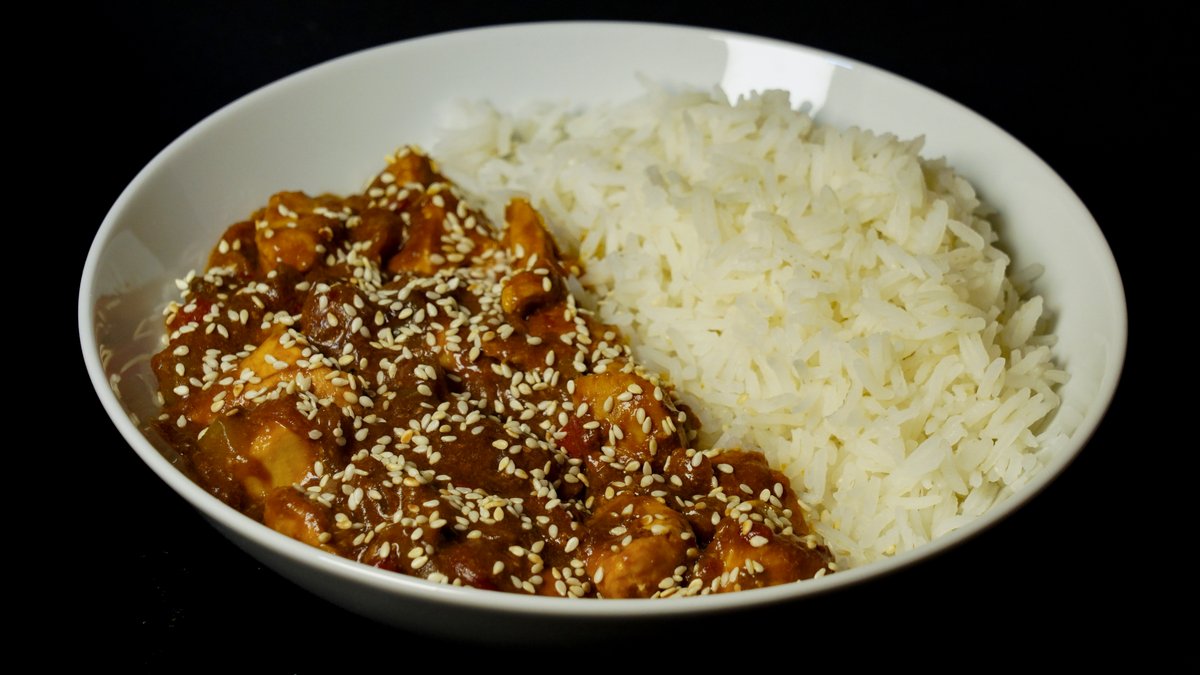 🇨🇳Pileći file 180 g, tikvica, crvena paprika, zelena paprika, šampinjoni, crveni luk, šargarepa, kari, soja sos, čili, sweet čili, susam, basmati pirinač 120 g