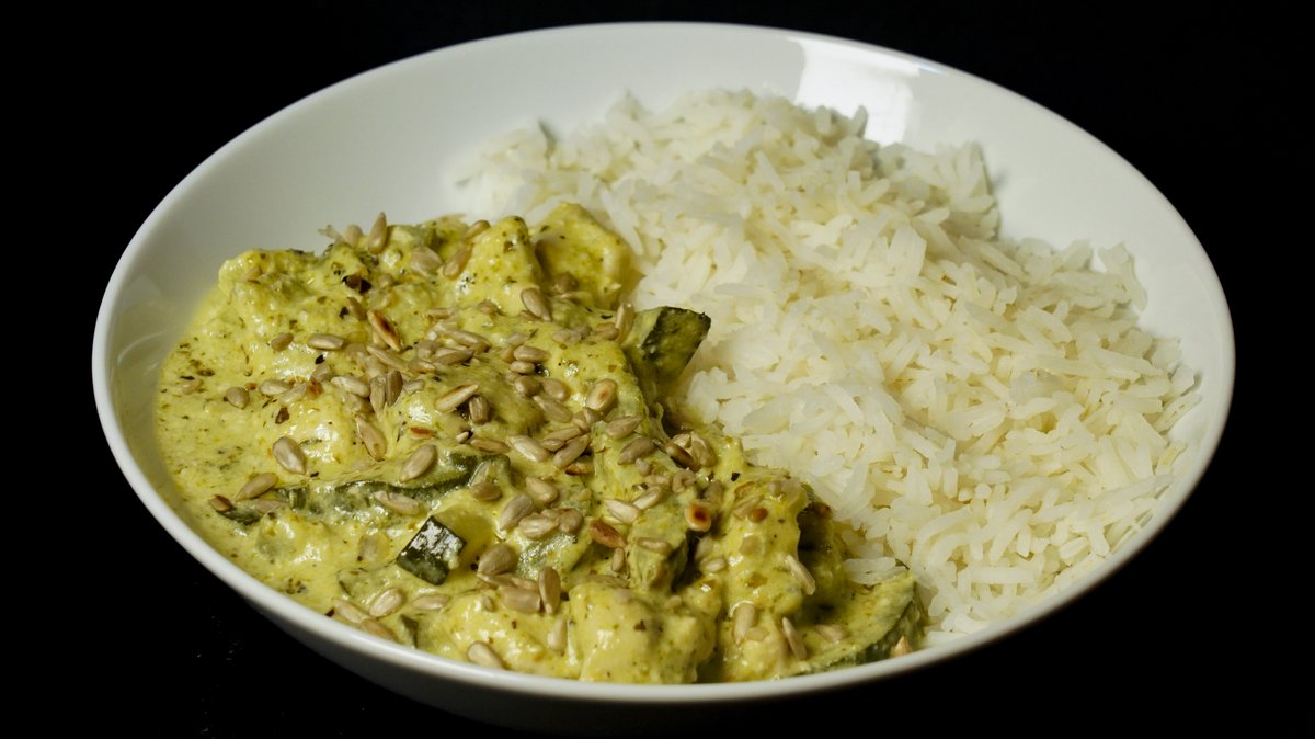 🇮🇹Pileći file 180 g, pesto, tikvice, neutralna pavlaka, beli luk, belo vino, semenke suncokreta, basmati pirinač 120 g