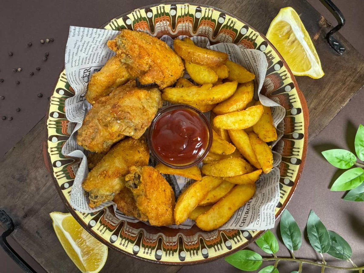 Pileća krilca 300 g, Barbollini začin za krilca, wedges krompir 150 g,BBQ sos.