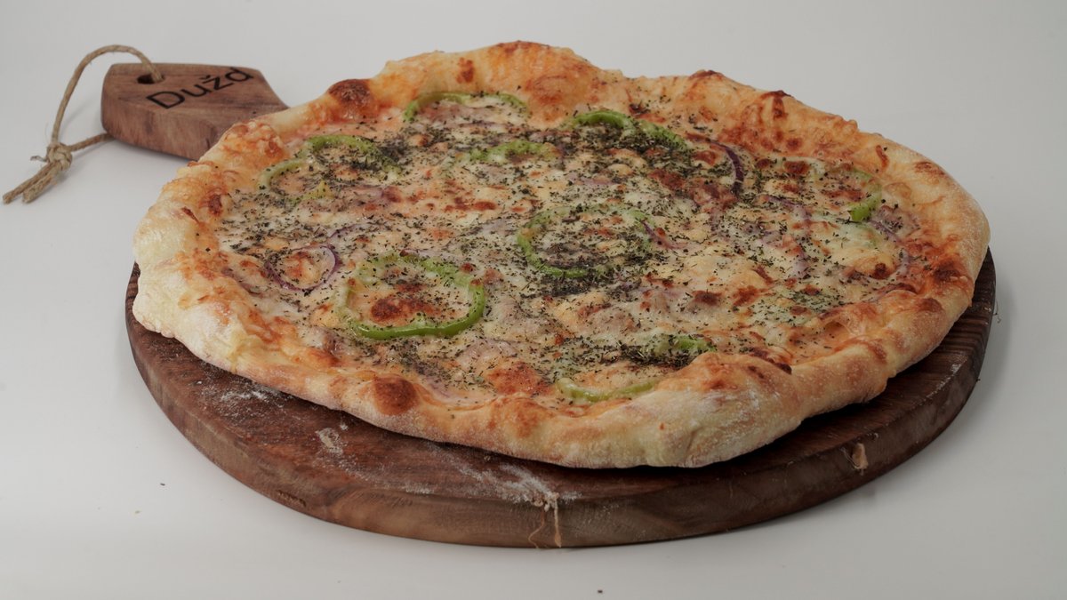 Tuna,crveni luk,masline crne,mocarela,bosiljak,pelat,paprika