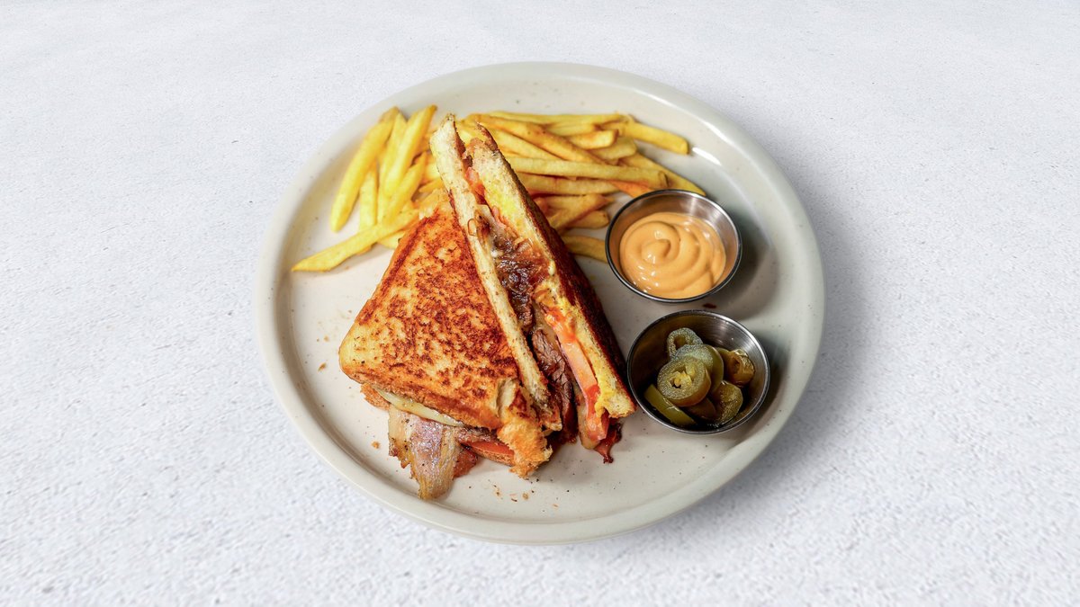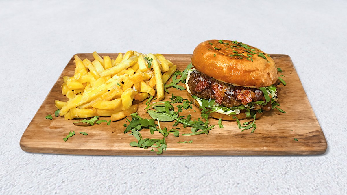 Tost hleb na puteru, medium rare ramstek, truffle aioli, senf dresing, gauda, karameliovnai luk, grilovana slanina, paradajz. Krompirići sa strane.