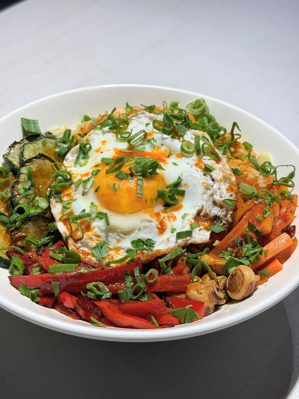 Bibimbap koji priča, sa junetinom, pirinčem, grilovanim povrćem, gonchjang sosom, susamom, mladim lukom i jajetom.
