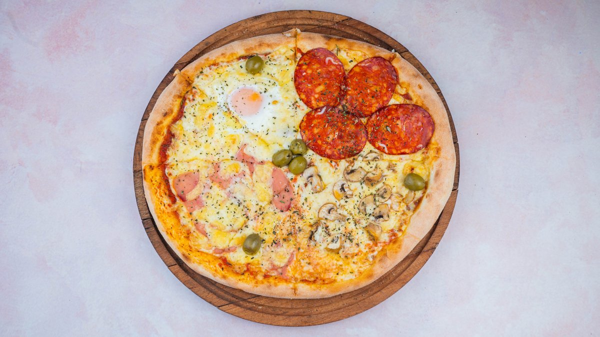 Paradajz sos, kačkavalj, pečurke, šunka, pavlaka, jaje