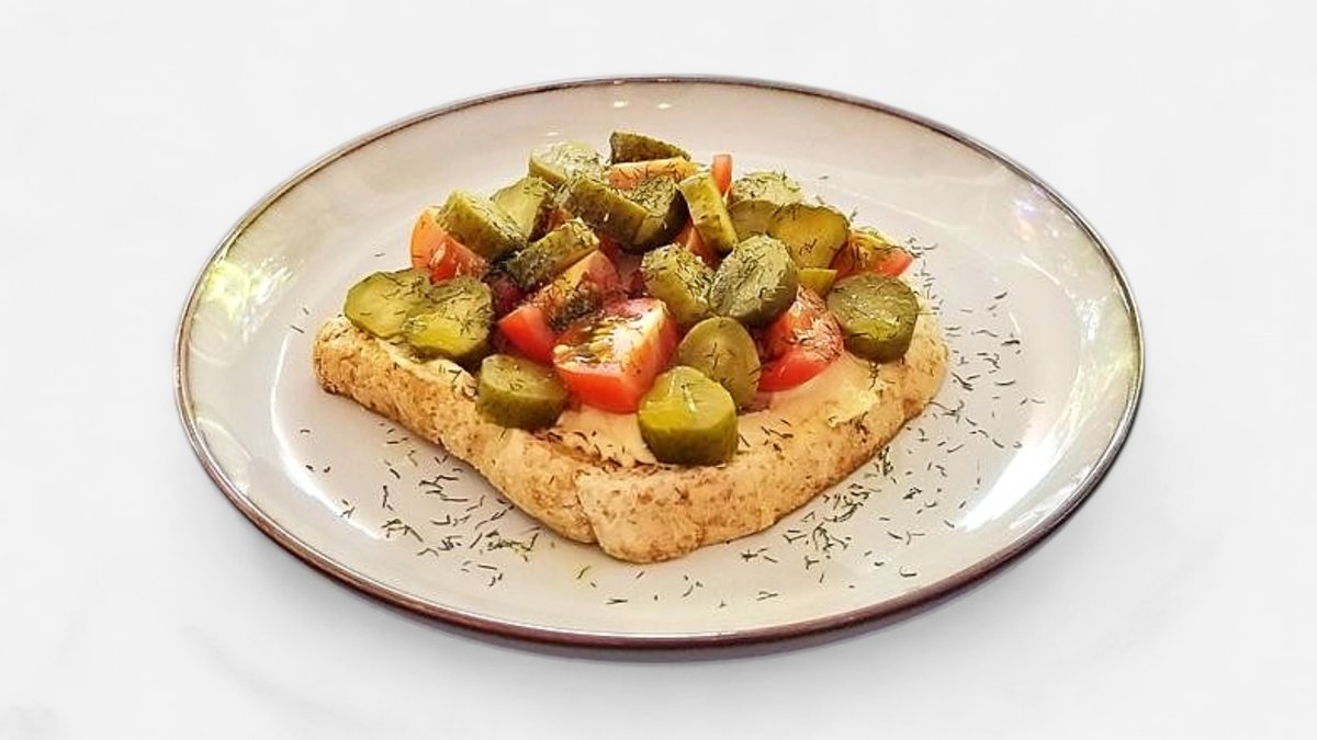 Ukusni Humus tost! Sadrži integralni pšenični tost, humus, čeri paradajz i kisele krastavce. Savršen za brzi obrok!