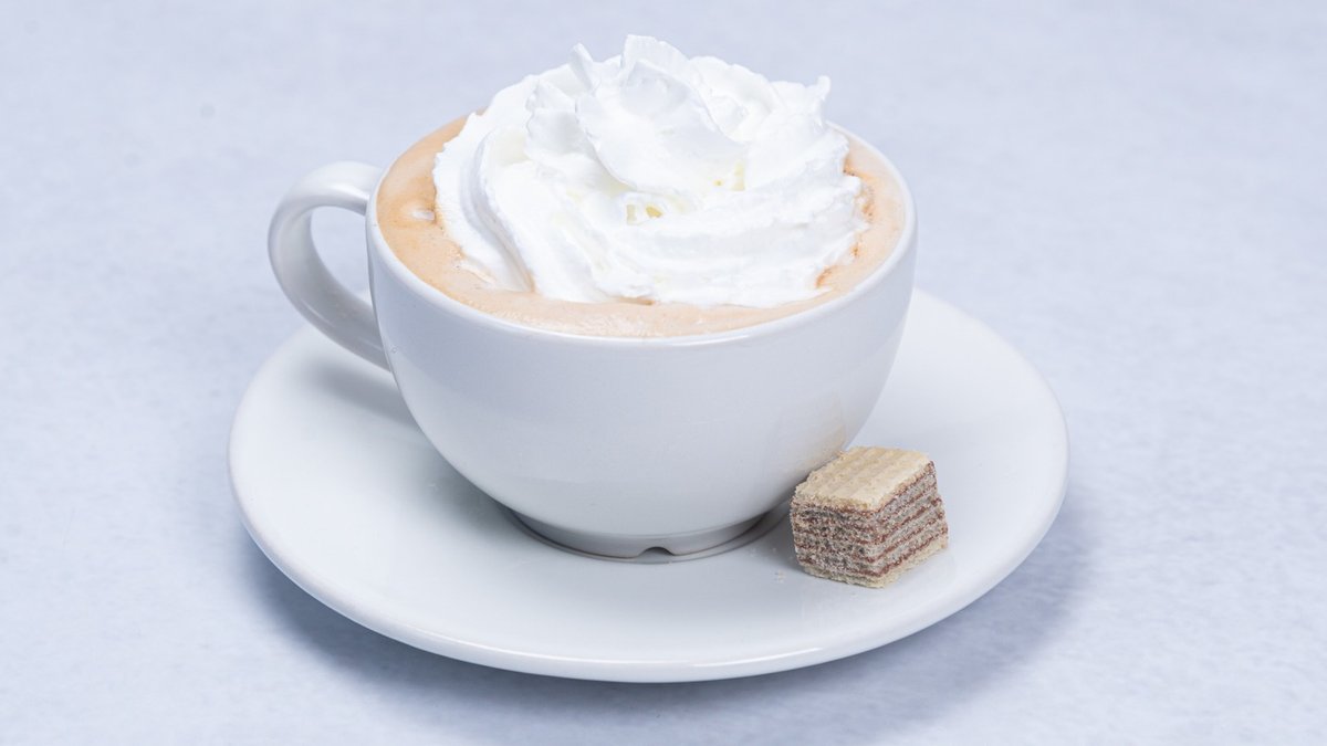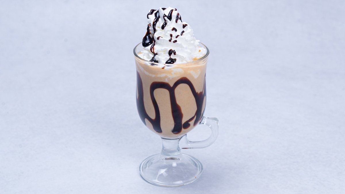 Raf kafa sa crnim biberom, čokoladnim sirupom i šlagom i čokoladnim mrvicama