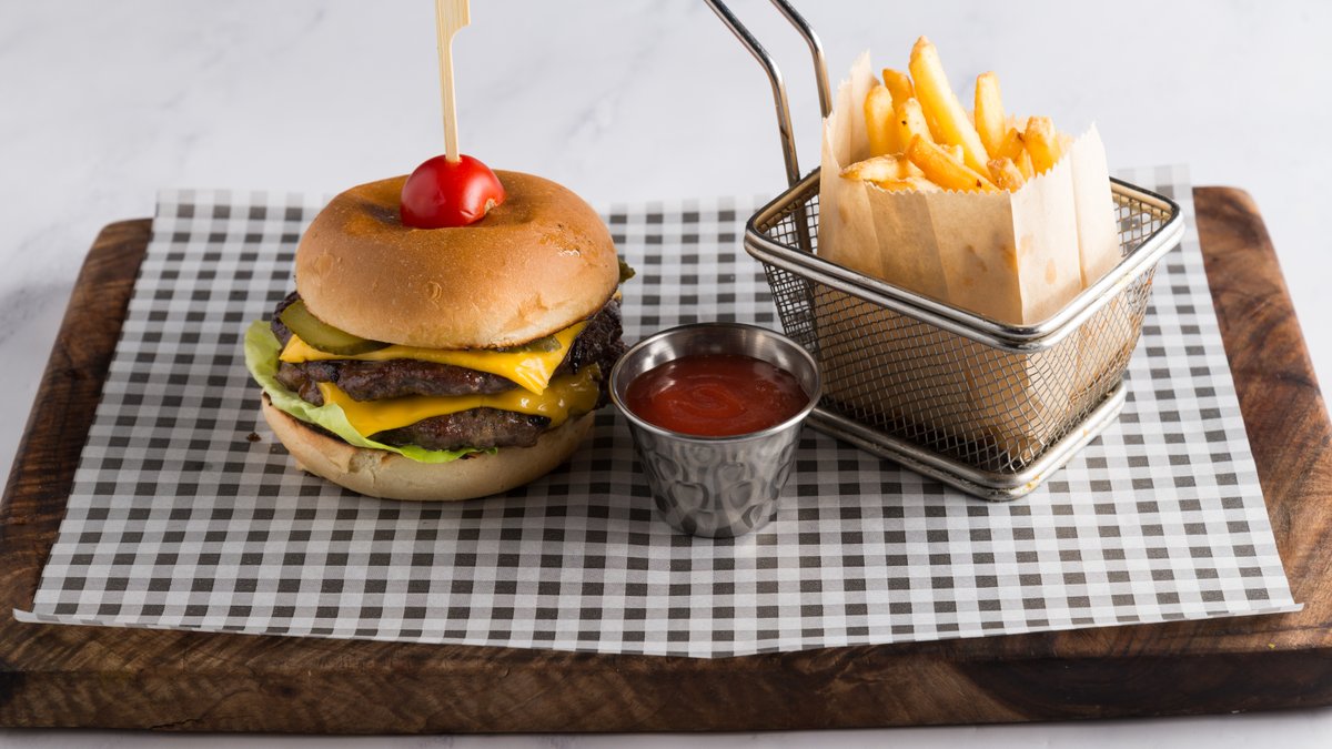 Sir, zelena salata, paradajz, ljubičasti luk, hrskava slanina, dijon senf, pomfrit