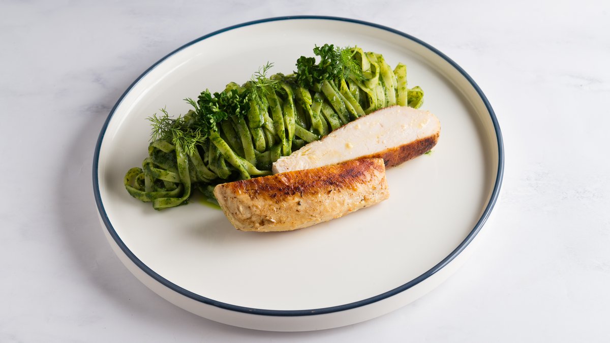 Grilovani pileći file, taljatele u sosu od kremastog putera, sa aromaticnim miksom začinskog bilja.