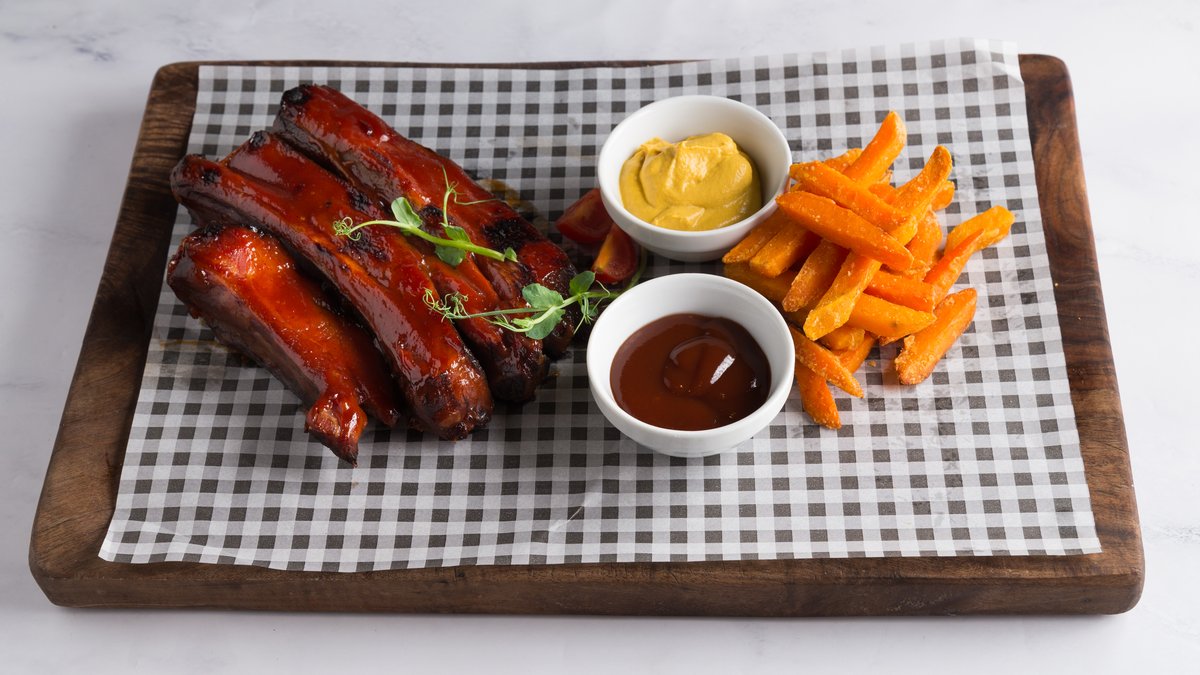 Svinjska rebra, BBQ sos, med, cherry paradajz, senf, sweet potato