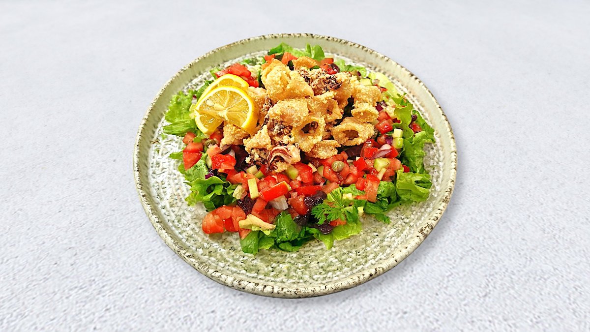 frigane lignje,mix salata,paradajz,ljubicasti luk,beli luk,krastavac,kapar,suseni paradajz