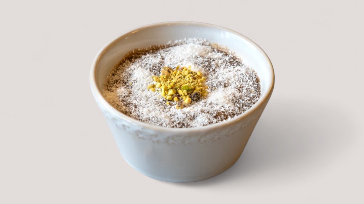 tradicionalni veganski puding posut kokosom i pistaćima Veganski