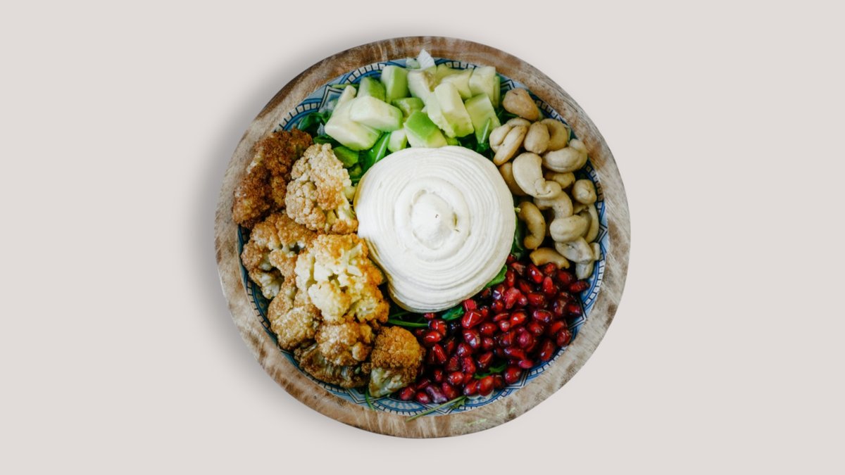 miks zelene salate, karfiol, avokado, nar, indijski orah i humus. Pomešano uz limun senf dresing Veganski (498kcal)