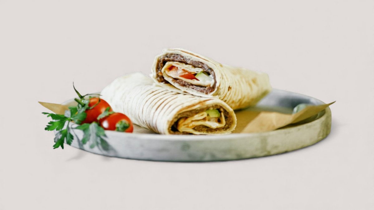 goveđe meso koje mami zvucima u tiganju sa autentičnim začinima za šavarmu i tahini sosom, paradajzom, kiselim krastavcima, sumak-lukom, umotano u lavaš hleb
