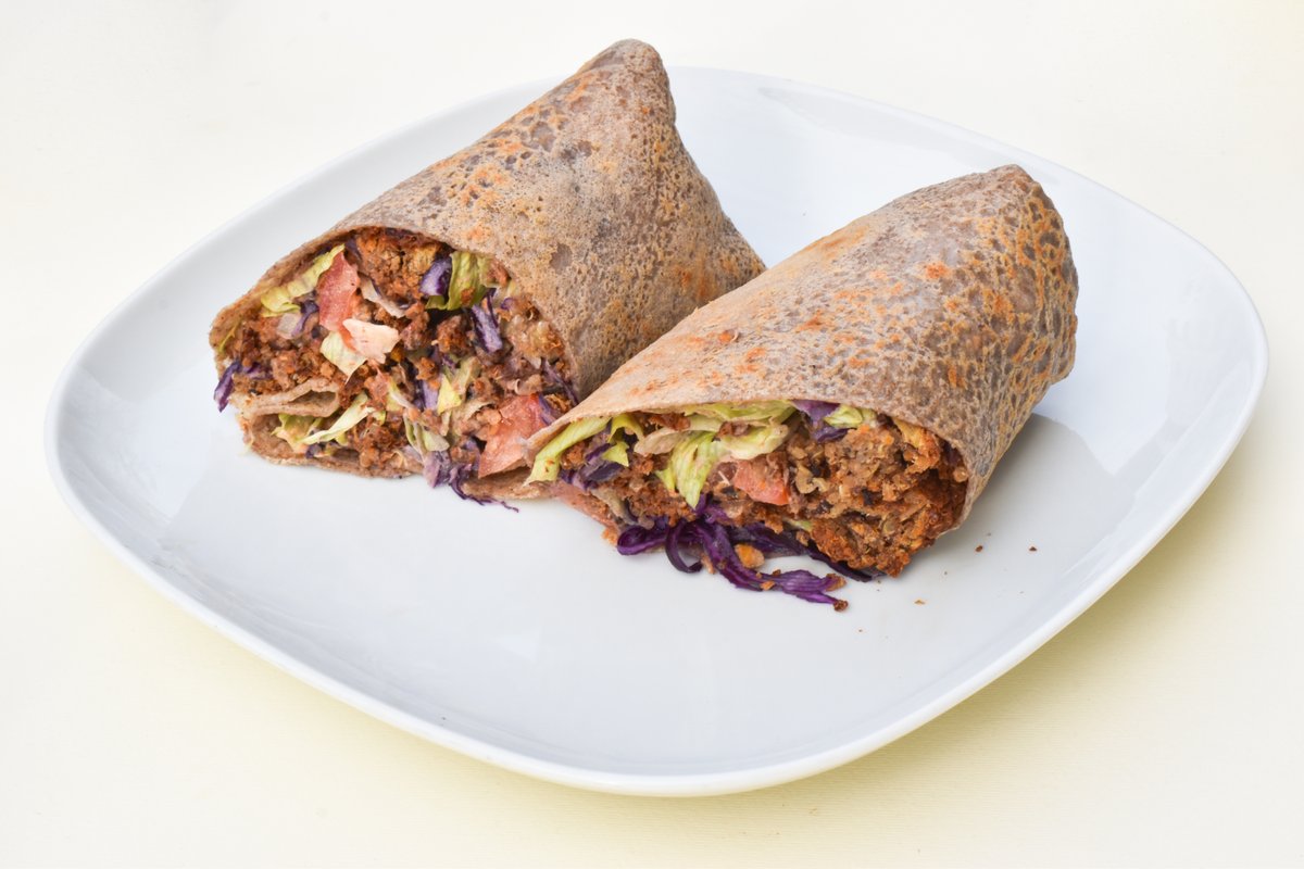 Tortilja, burger smesa u komadima, Mayorazum dresing, baby spanać, iceberg, šargarepa, paradajz, kukuruz šecerac. BURGER SMESA: pečena u rerni bez masnoće, sastav: leblebija, crni luk, šargarepa, spanać, kikiriki puter, suncokret, himalajska so, origano, biber, bosiljak. MAYORAYUM dresing sastav: indijski orah, voda, limun, beli luk, urma, himalajska so. SASTAV TORTILJE: heljda, kinoa, voda, lan, beli luk, suncokret, himalajska so TORTILJA SE PEČE NA VRLO MALO KOKOSOVOG ULJA! *Vegan, Bez glutena, Bez dodatog šećera, Bez industrijskih sastojaka, Posno!