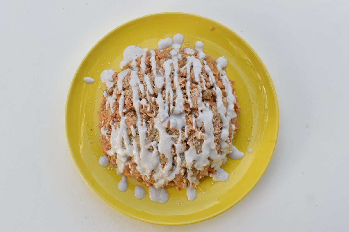 Sastav testa: banana, kinoa, voda, soda bikarbona bez aluminijuma + Cimetino namaz BEZ ŠEĆERA (sastav: urme, badem, jabuka, cimet, himalajska so.). *Vegan, Bez glutena, Bez dodatog šećera, Bez industrijskih sastojaka, Posno!
