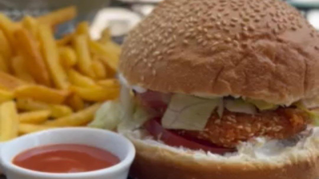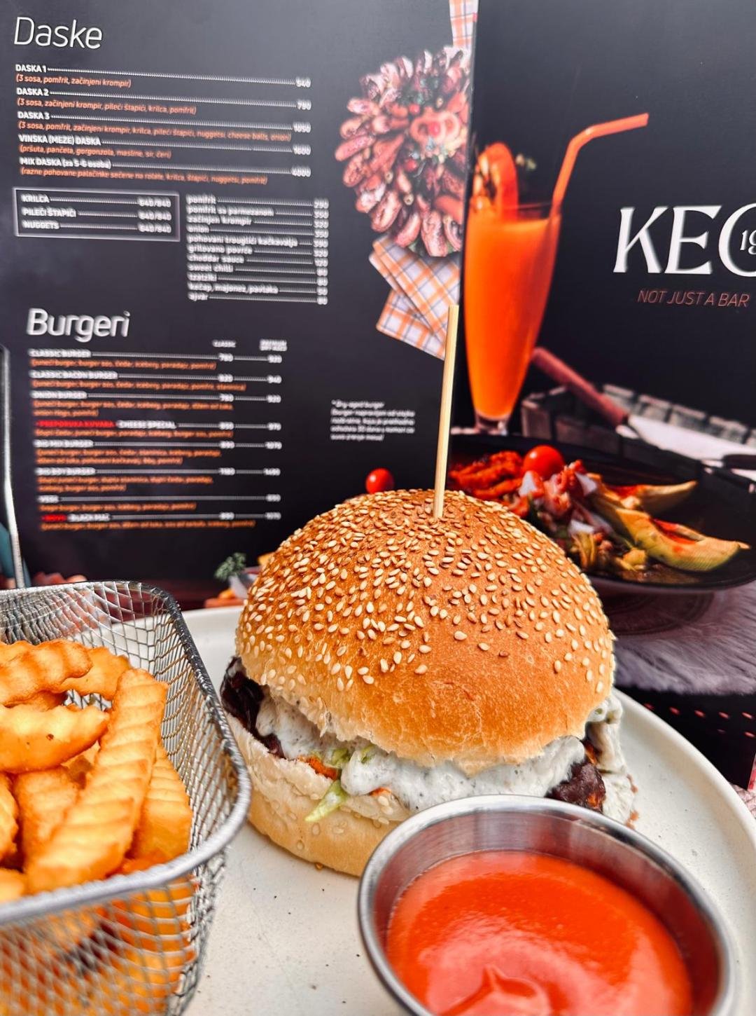 Burger sos, kecap, zelena salata, pileci burger sa kackavaljem, pomfrit