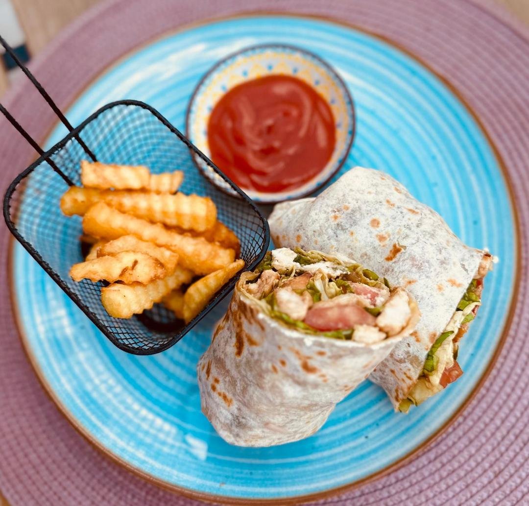 Tortilja, grilovana piletina, burger sos, kukuruz, paprika, kackavalj
