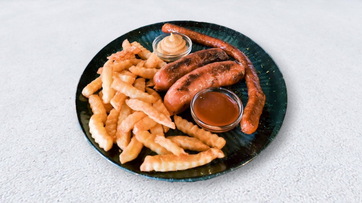 1 kobasica sa kačkavaljem, 2 dimljene roštiljske obasice, pomfrit
