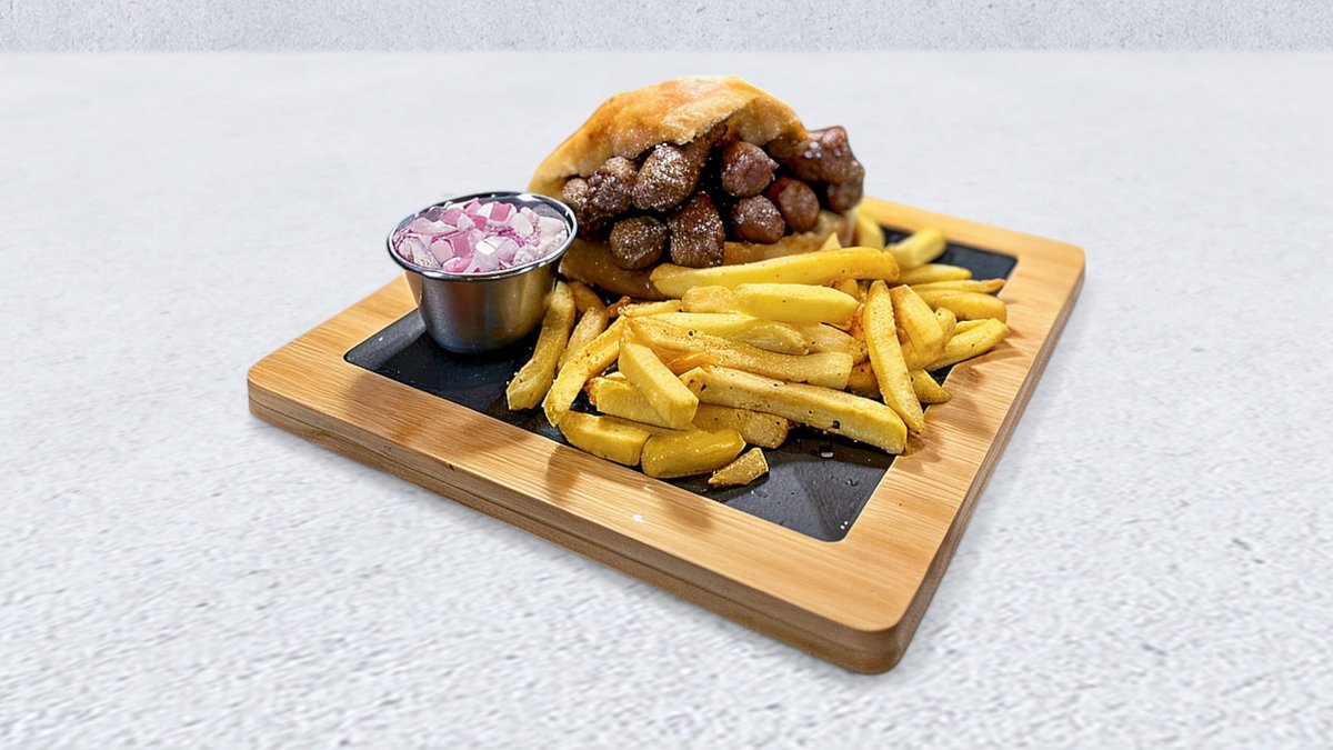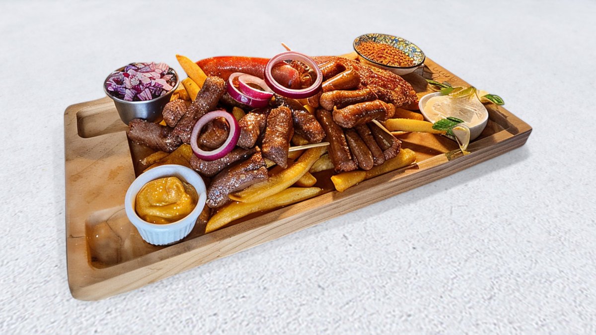 velika plljeskavica, 10kom ćevapa, 1kobasica sa kačkavaljem, 2dimlj.roštljske, začinjeni krompir, pomfrit, senf, tucana ljuta, kajmak i luk