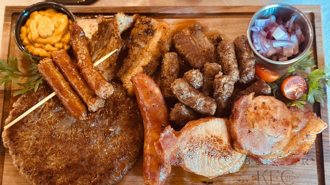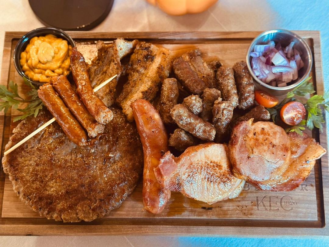 velika pljeskavica, 20kom ćevapa, 1kobasica sa kačkavaljem, 2 dim.roštiljske kobasice, 2 pileće karadjordjeve, 4kom pohovan kačkavalj, 4 onion ringsa, začinjeni krompir, pomfrit, senf, tucana ljuta, luk i kajmak