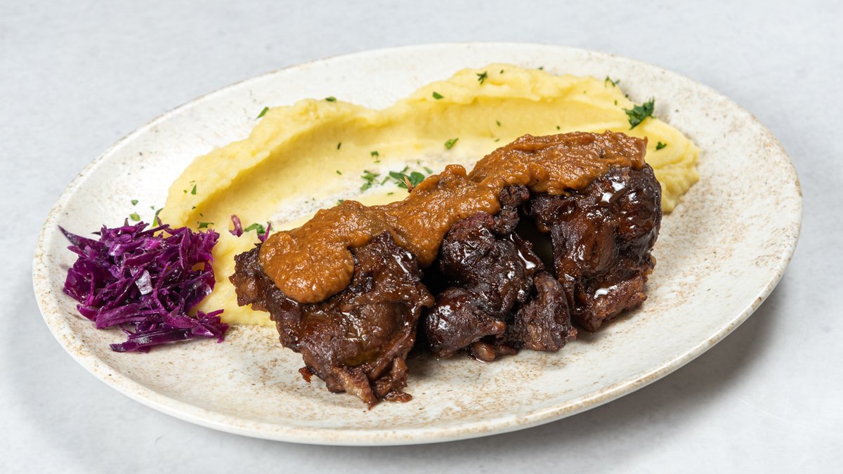 Sporo pečeni juneći obarzi, pire krompir, sos od korenastog povrća