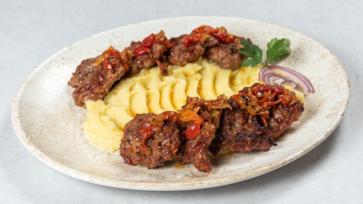 100% juneće meso, pire krompir, sos od kajmaka i pečene paprike