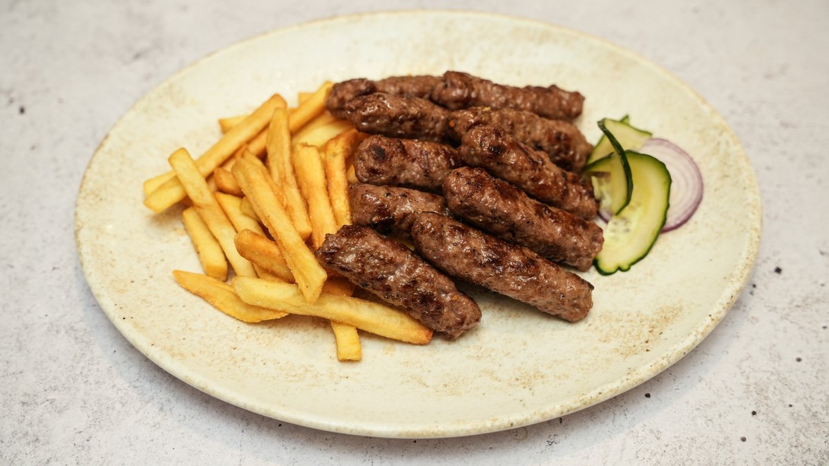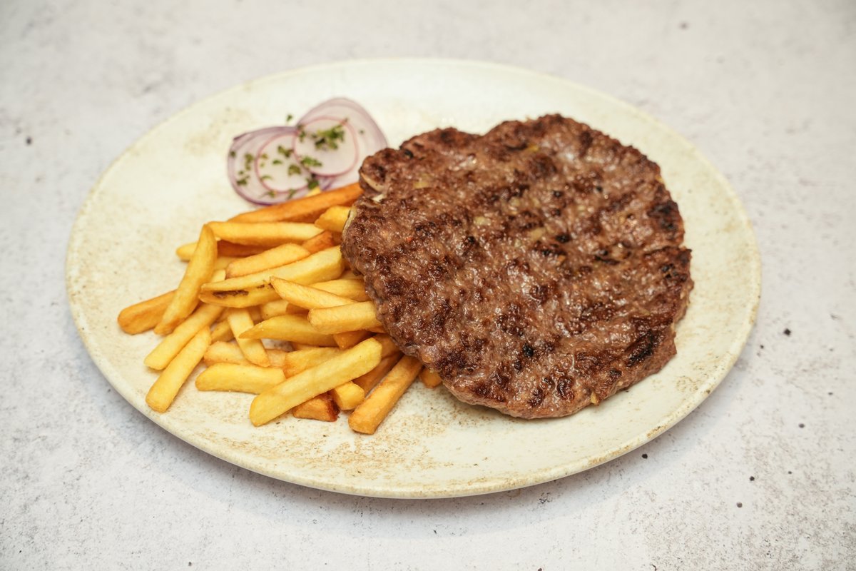 100% juneće meso, luk, tucana paprika, pomfrit