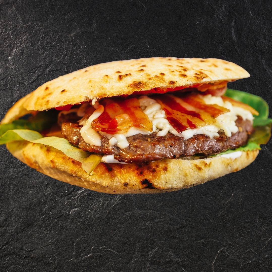 130g mešavine junećeg i svinjskog mesa, dimljena slanina, sir, zelena salata, paradajz, kiseli krastavci, pavlaka, kečap u sveže pečenoj lepinji