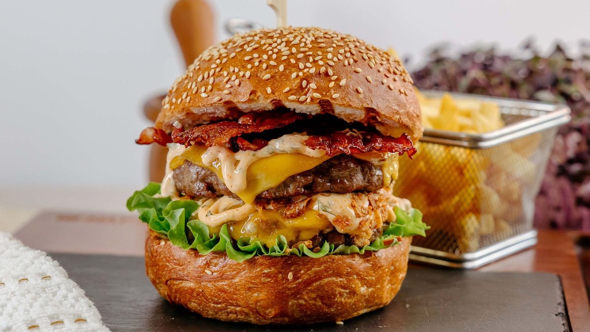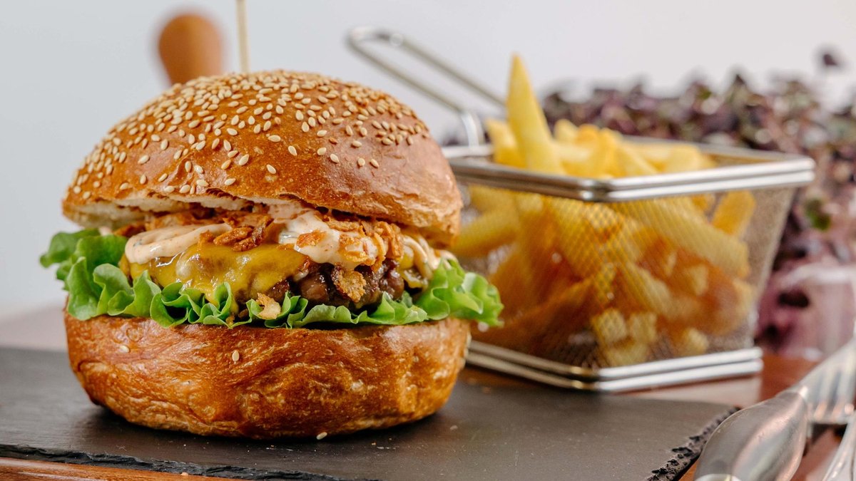 Guacamole Veggie Burger spaja svežinu endivije, kombinaciju svežeg i sušenog paradajza i nežnu teksturu biljnih sastojaka, dok kremasti guacamole donosi pun, zaokružen ukus. Fini prženi luk unosi aromatičnu hrskavost, a jelo je obogaćeno blagim kečap–reliš sosom od sitno seckanog kiselog krastavca i ljubičastog luka, od kojeg se mala količina dodaje i unutar burgera radi dodatne sočnosti. Hrskavi štapići slatkog krompira zaokružuju ovo moderno i profinjeno vegeterijansko jelo.