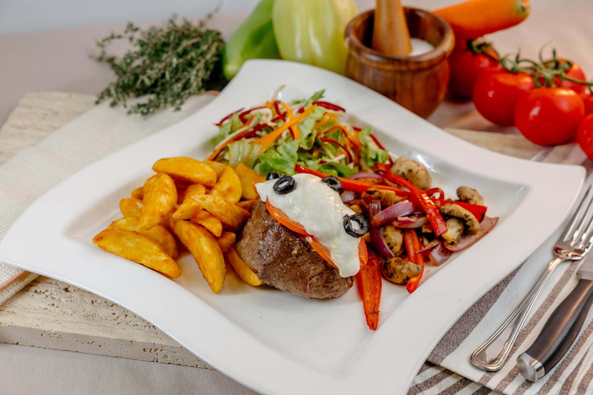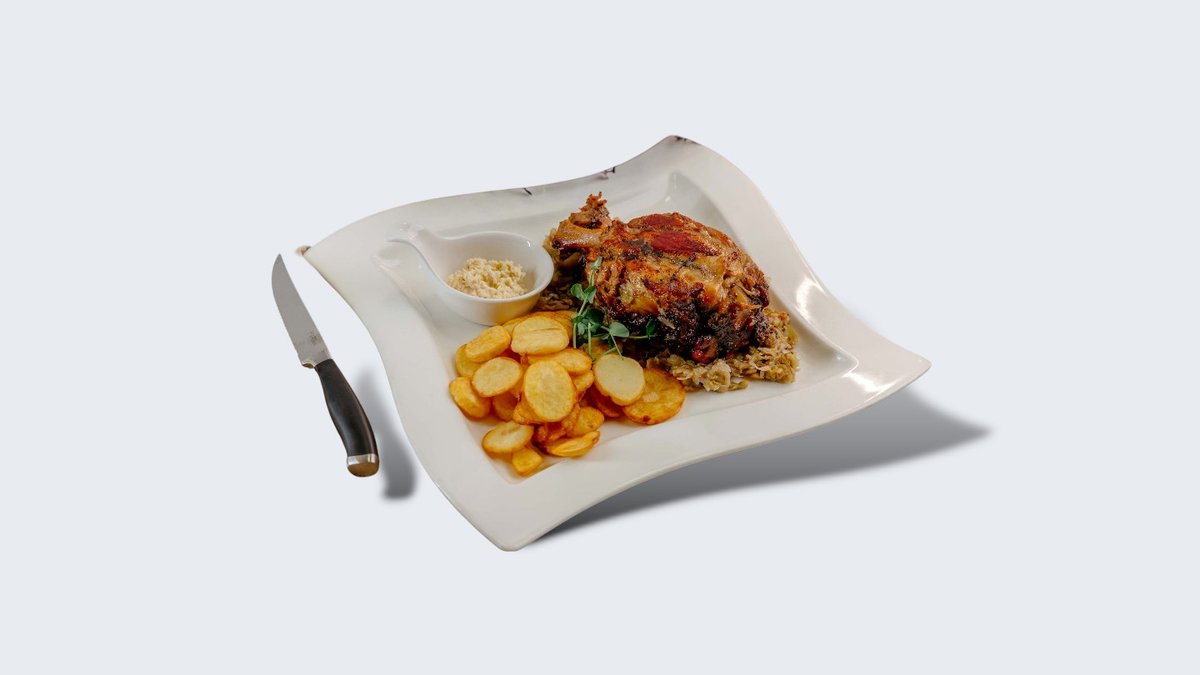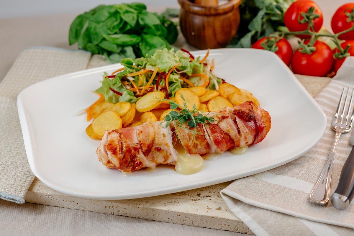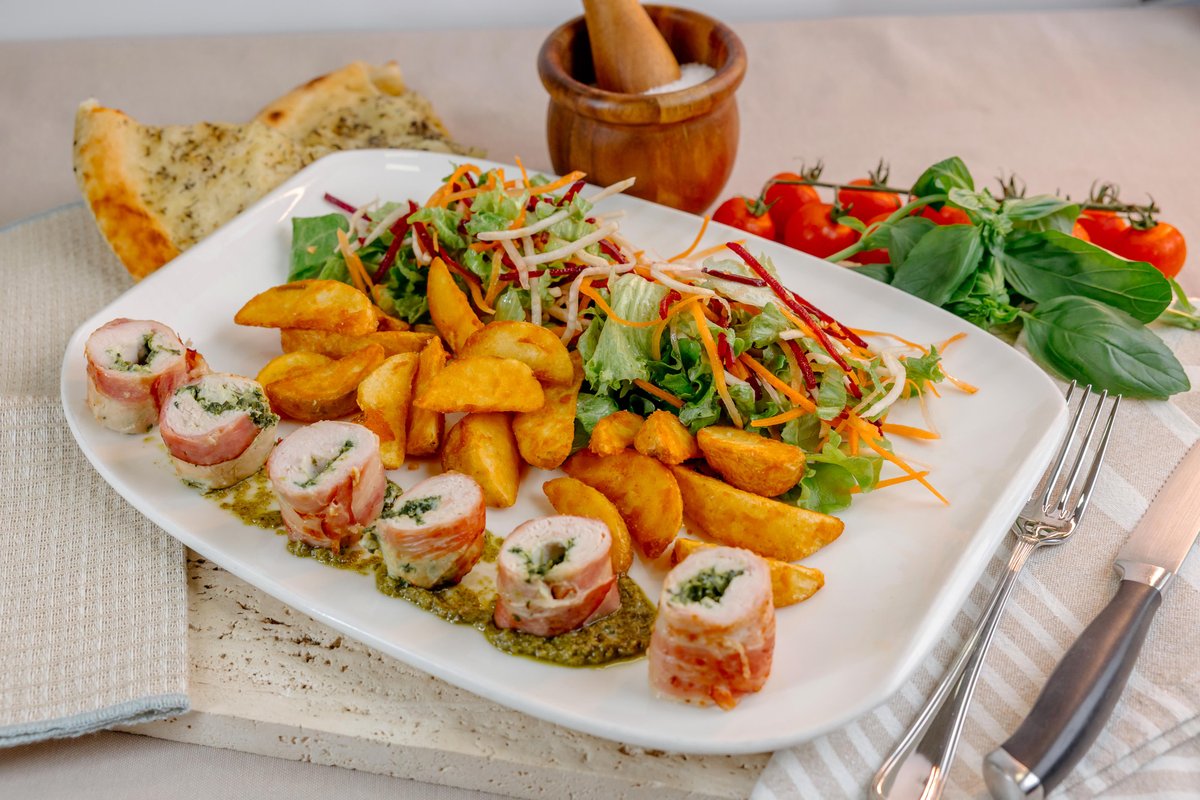 Pečeni Rolat je jelo koje godinama nosi pečat tradicije našeg restorana, sada predstavljeno u modernijem, elegantnom servisu. Šunka pažljivo uvijena oko trapist sira peče se u pizza peći, gde dobija bogat, karamelizovan ukus i neodoljivu hrskavo-meku teksturu. Preko rolata dodatno se topi sloj trapista koji se zarumeni i nežno preliva preko ivica. Uz jelo se služi lagana iceberg salata sa našim grčkim dresingom, grčkim jogurtom i notom limuna, koja donosi osvežavajuću ravnotežu. Kompletan doživljaj upotpunjuje mekana domaća lepinja — toplo, poznato i istinski renesansno.