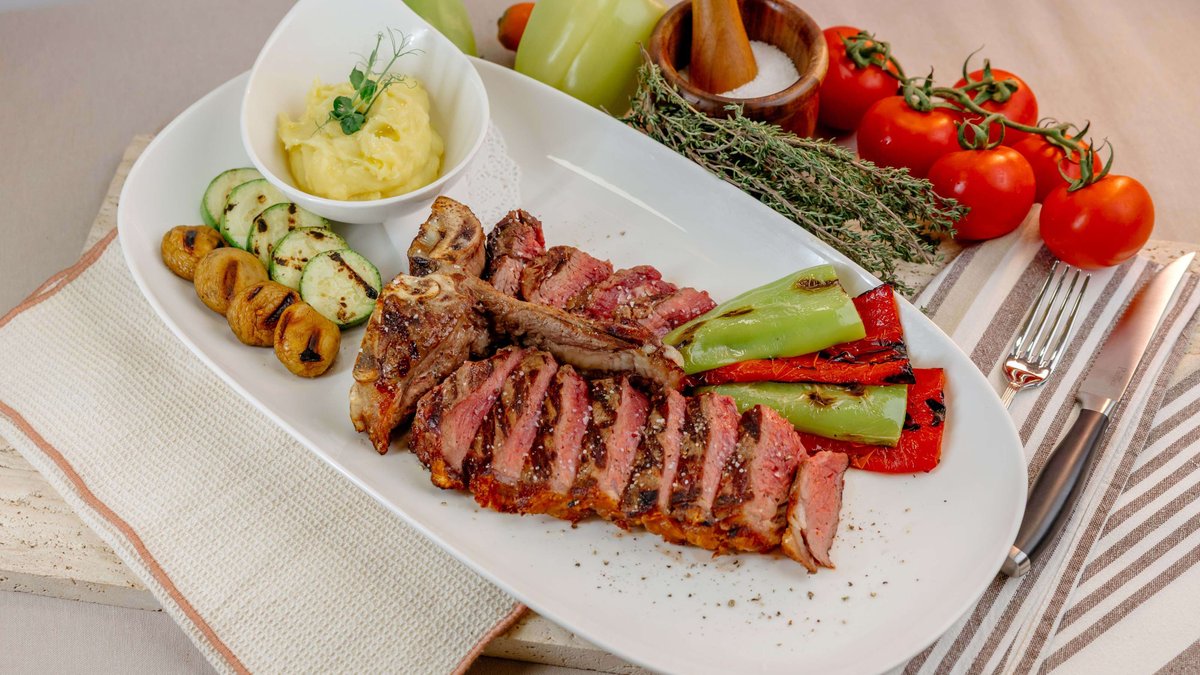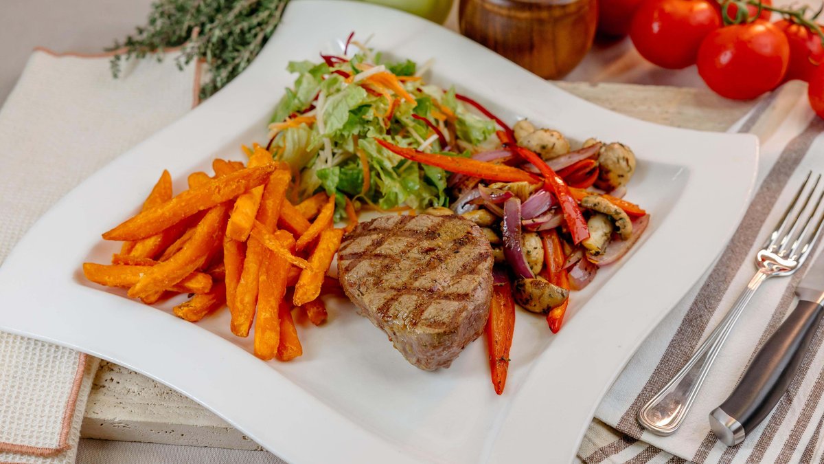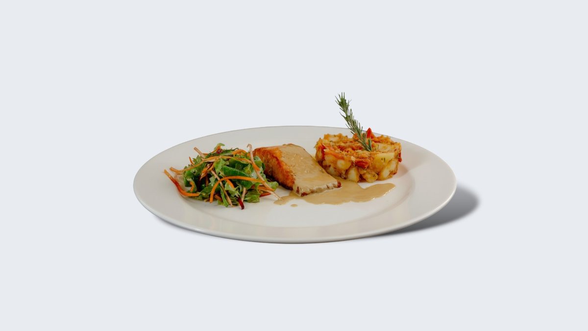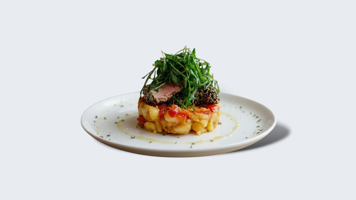 Sočan tuna steak obložen kombinacijom crnog i belog susama peče se medium, čime se zadržava puna tekstura i prirodan ukus ribe, uz blago zapečenu aromatičnu koricu. Servira se na podlozi od restovanog krompira pripremljenog sa maslinovim uljem, cherry paradajzom i ruzmarinom, dok sveža rukola dodaje kontrast i svežinu. Jelo je zaokruženo aromatičnim sosom od meda, dijon senfa, soka od narandže i soja sosa, koji donosi savršen balans slatkih, citrusnih i umami nota. Uz ovo jelo poslužuje se prepečena chiabatta.