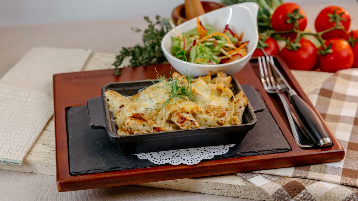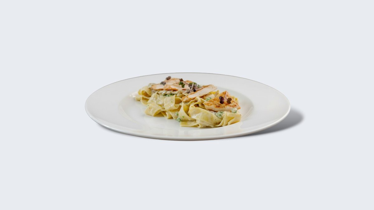 Pasta Piletina je jelo koje spaja kremastu eleganciju i puninu ukusa. Široke pappardelle obavijene su bogatim, ali uravnoteženim sosom od neutralne pavlake i gorgonzola sira, koji donosi blagu aromatičnost i dubinu. Sveži šampinjoni i slatki grašak dodaju teksturu i svežinu, dok sočno grilovani pileći file zaokružuje jelo toplom, mesnom notom. Harmonična kombinacija ukusa, savršena za ljubitelje kremastih pasta.