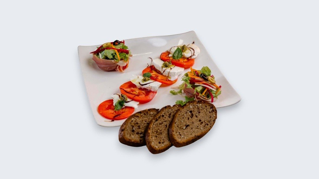 Caprese Salata „Renaissance“ donosi prepoznatljive mediteranske ukuse u dopadljivoj, savremeno serviranoj formi. Sočni kolutovi paradajza i kremasta mozzarella čine osnovu ovog klasičnog jela, dok pesto genovese unosi aromatičnu svežinu bosiljka i maslinovog ulja. Dva tanka slajsa pršute daju gurmansku notu, masline dodatno obogaćuju ukus, a žilijen salata donosi laganu i osvežavajuću kontrastnu teksturu. Ova Caprese varijanta predstavlja savršen izbor za goste koji žele elegantno, lagano i izbalansirano hladno predjelo.