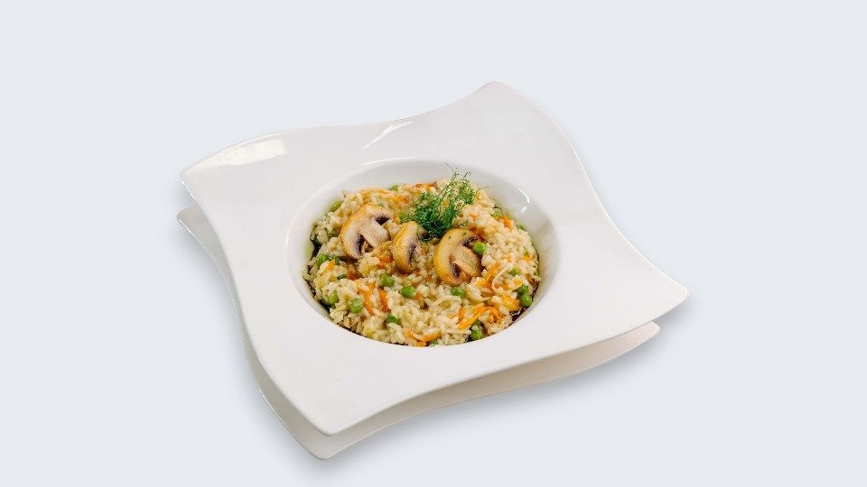 Ovaj lagani, posni i vegeterijanski rizoto spaja kremastu teksturu arborio pirinča sa nežnim žilijen trakama šargarepe i celera. Grašak i šampinjoni daju punoću, dok pečeno bundevino ulje donosi toplu, orašastu notu. Jelo je izbalansirano, aromatično i čvrsto premium karaktera.