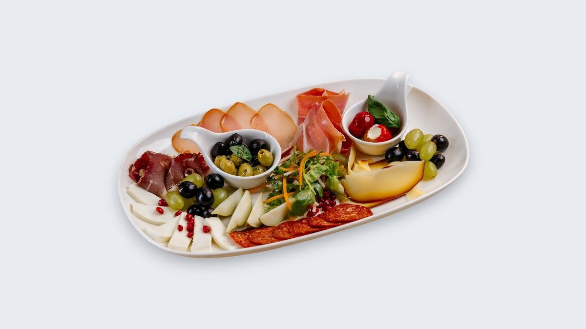 Antipasti Platter „Renaissance“ predstavlja pažljivo sastavljenu kombinaciju najfinijih suhomesnatih proizvoda i svežih delikatesnih dodataka. Na tanjiru se nalaze pršuta, sušeni ramstek, svinjska pečenica i goveđi kulen, svaki sa svojim prepoznatljivim karakterom i aromom. Uz njih dolaze punjene cherry paprike sa sirom, mešane masline, beli i crni grozd, nežne kriške kruške i nekoliko zrna nara za osvežavajuću notu. Lagano začinjena žilijen salata i sveži bosiljak zaokružuju ovo predjelo u skladnu, vizuelno raskošnu celinu. Savršen izbor za goste koji žele bogat, raznovrstan i elegantan početak obroka — samostalno ili za deljenje.